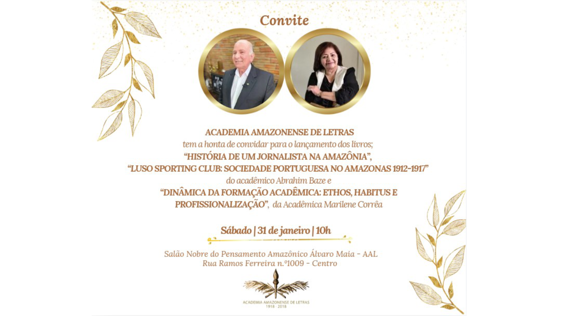 Com duas obras a serem lançadas, a primeira intitulada “História de um Jornalista na Amazônia” do acadêmico e atual Presidente da Academia Amazonense de Letras, Abrahim Baze, promove ao leitor uma viagem no túnel do tempo por meio de um resgate sobre os grandes acontecimentos ocorridos na época e biografias de grandes personalidades, uma obra repleta de registros fotográficos históricos, em outro aspecto literário na obra “Luso Sporting Club: Sociedade Portuguesa no Amazonas 1912-1917” Abrahim Baze aborda temas importantíssimos sobre a sociedade lusitana em sua enorme contribuição no desenvolvimento cultural para o estado do Amazonas através do esporte e da música.